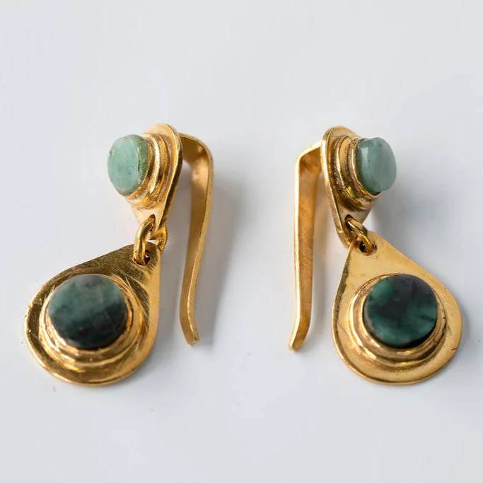 Named after the ancient Persian prophet and philosopher Zarathustra, these earrings embody the wisdom and divine vision of a seer. Handcrafted from high-quality Italian brass with a 22k gold-plated, semi-matte finish, they are designed for 4mm gauged lobes and inlaid with natural raw Emerald—a stone long revered for clarity, prosperity, and spiritual awakening.